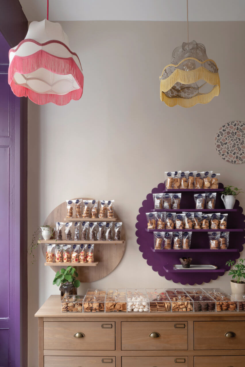 Ici, pour cet agencement de magasin, nous avons créé une véritable identité de marque, en collaboration avec mon bras droit créatif Les Manies de Marion. L’objectif était de faire en sorte que La Biscuiterie se sente unique et corresponde à l’ambiance chaleureuse et accueillante qu’elle souhaite transmettre. La couleur prune, choisie avec soin, est restée le maître mot de l’agencement. Nous avons également imaginé des présentoirs muraux à croquer, qui non seulement mettent en valeur les produits, mais créent aussi une atmosphère conviviale. En ajoutant des éléments décoratifs tels que des plantes et des éclairages doux, nous avons accentué l’originalité de ce qui est proposé.